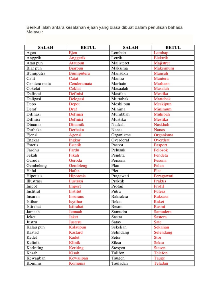 Senarai Ejaan Yang Betul Dalam Bahasa Melayu Yang Sering Kita Keliru